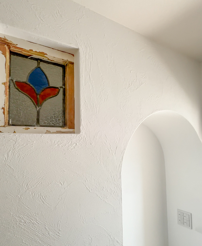 アーチ状のニッチも塗り壁ならでは。アンティークなステンドグラスがマッチします。